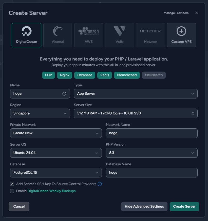 早速ですがデプロイしてみましょう。DigitalOceanを使います。Forgeの"Create Server"で、下記のような内容で作成します。