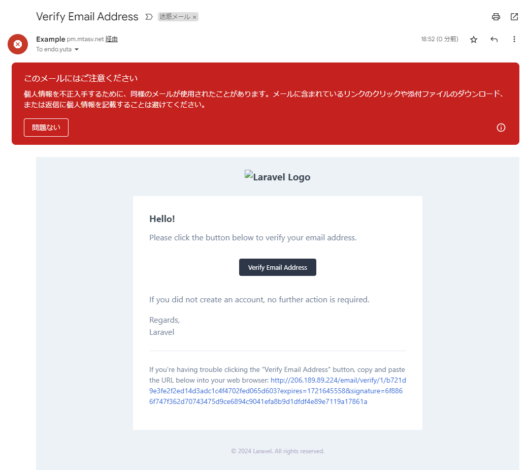 送信成功しました!しかし、まあ迷惑メールフォルダに入りますし、警告は出るしで、あくまでテスト用ですね。(当然ですが、Postmarkでアカウント承認をして、ドメインの認証をすれば、回避できるはずです。)